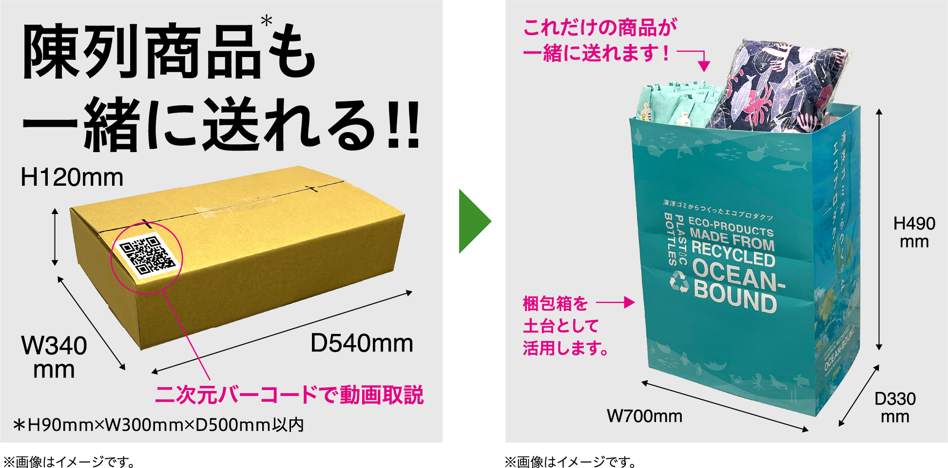 店頭什器として活用される“通称”「ジャンブルボックス」は、商品を大量かつ気軽に手に取れるように配置するディスプレイ什器の一種です。主にワゴン型・ボックス型の什器を用い、商品を整然と並べるのではなく、あえて“ざっくり”と入れることで、宝探し感や掘り出し物を探す楽しさを演出します。視認性・インパクト性が高く、ボリューム感のある陳列により遠くからでも目を引きやすく、商品を気軽に放り込めるような設計のため、在庫の入れ替えや補充が容易で、結果として陳列効率が高まり売り場の回転率を上げる効果もあります。SPGsの運賃さがる君/ゴミデネーゼシリーズ「ジャンブルボックスeco100」は、商品と一緒に持ち運びや配送が可能。組み立ても簡単なので、どこでも誰でも素早く見栄え良く商品を展開することが出来ます。またSPGs製品でお馴染みの、外装ダンボール箱が什器の一部になり不要なゴミが一切出ず、梱包サイズもコンパクトな100サイズだから、発送運賃が従来型と比較して50%(*1)も削減できます。これにより販促資材の物量を減らし輸送時に発生するトラックのCO2削減にも繋がります。SPGsの「ジャンブルボックスeco100」は、その特性からPOPストアやイベント使用などに特に適しています。
